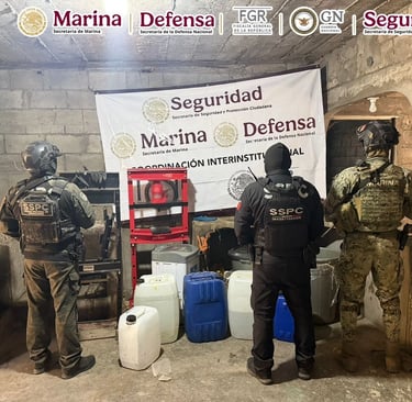 Durante los operativos, las fuerzas federales aseguraron armas largas, cargadores, cartuchos, droga y equipo utilizado para la fabricación de sustancias sintéticas.