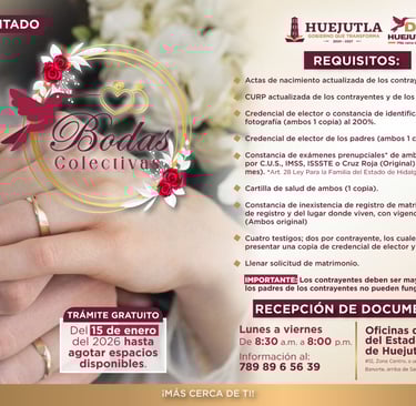 El Sistema DIF Huejutla, encabezado por la Dra. Kristel Rodríguez Flores, en coordinación con el Gobierno Municipal que preside el Lic. Alfredo San Román Duval, anunció la apertura del registro para las Bodas Colectivas 2026, las cuales se llevarán a cabo el próximo mes de febrero.