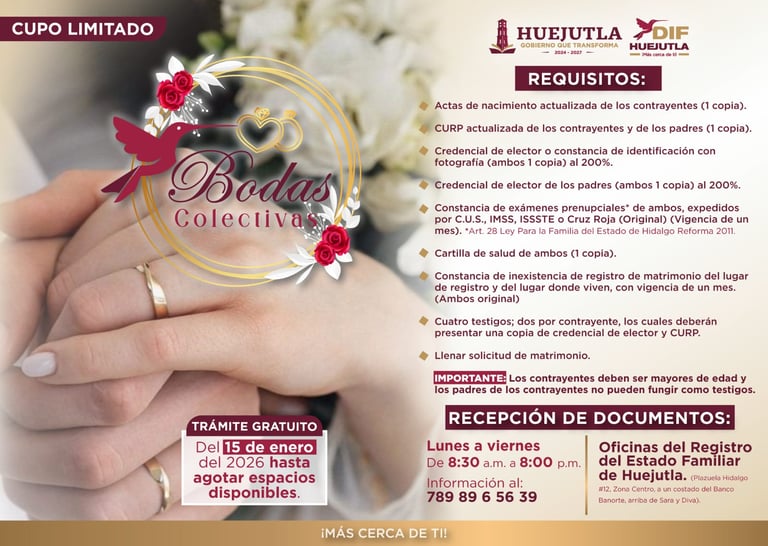 Las parejas interesadas en regularizar su situación legal pueden obtener mayores informes llamando al teléfono 789 896 5639 o acudiendo directamente a las oficinas del Registro del Estado Familiar de Huejutla. La recepción de documentos inició el 15 de enero y permanecerá abierta hasta agotar los espacios disponibles, en un horario de lunes a viernes de 8:30 de la mañana a 8:00 de la noche.