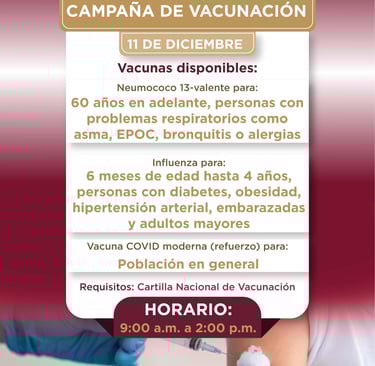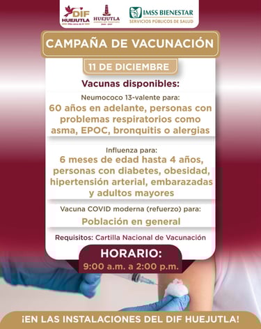 Ante el inicio de la temporada invernal, al cuidado de la salud familiar, el Gobierno Municipal y el Sistema DIF Huejutla, en coordinación con IMSS Bienestar, invitan a la población a participar en la Jornada de Vacunación que se llevará a cabo el día de mañana, jueves 11 de Diciembre en sus instalaciones, de 9:00 a.m. a 2:00 p.m.